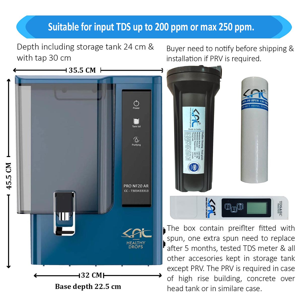 - KNL Healthy Drops, model KNL PRO NF20 AR SS UV (Blue & black), with pH regulator & SS 304 UV chamber, input TDS < 250 ppm, Reduces TDS (15-25)% from raw water.