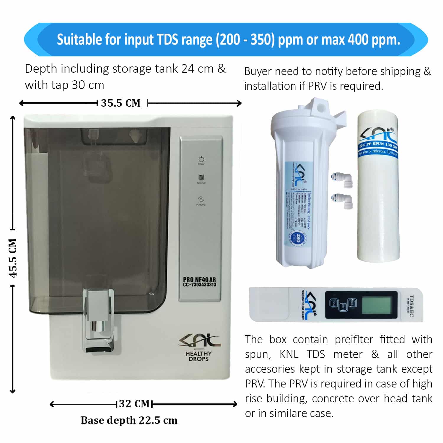 - KNL Healthy Drops, model KNL PRO NF40 AR SS UV, with pH (alkaline) regulator & SS 304 UV chamber, input TDS range (200-350)ppm, Reduces TDS (40-50)% from raw water.