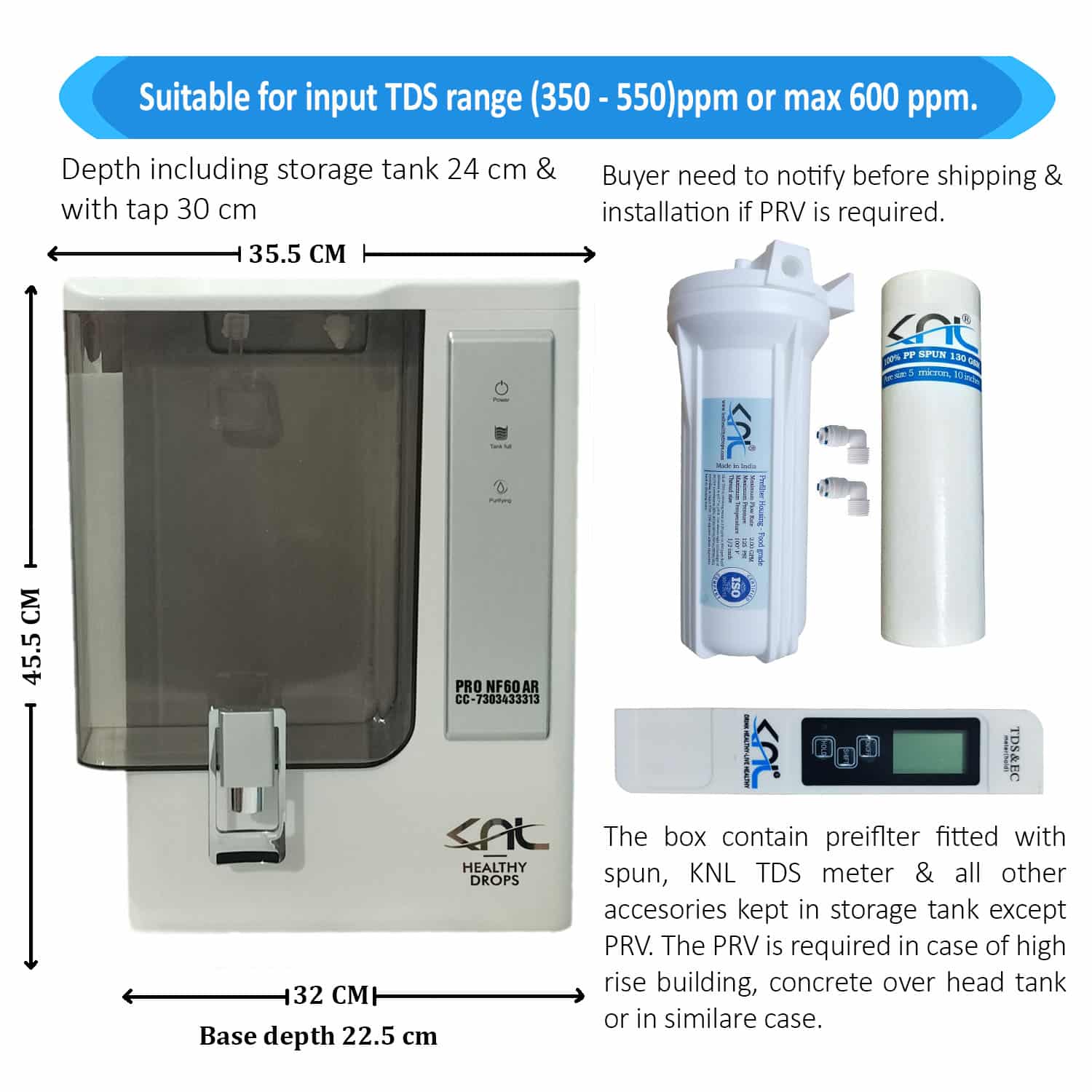 - KNL Healthy Drops, model KNL PRO NF60 AR SS UV, with pH (alkaline) regulator & SS 304 UV chamber, input TDS range (350-600)ppm, Reduces TDS (60-70)% from raw water.