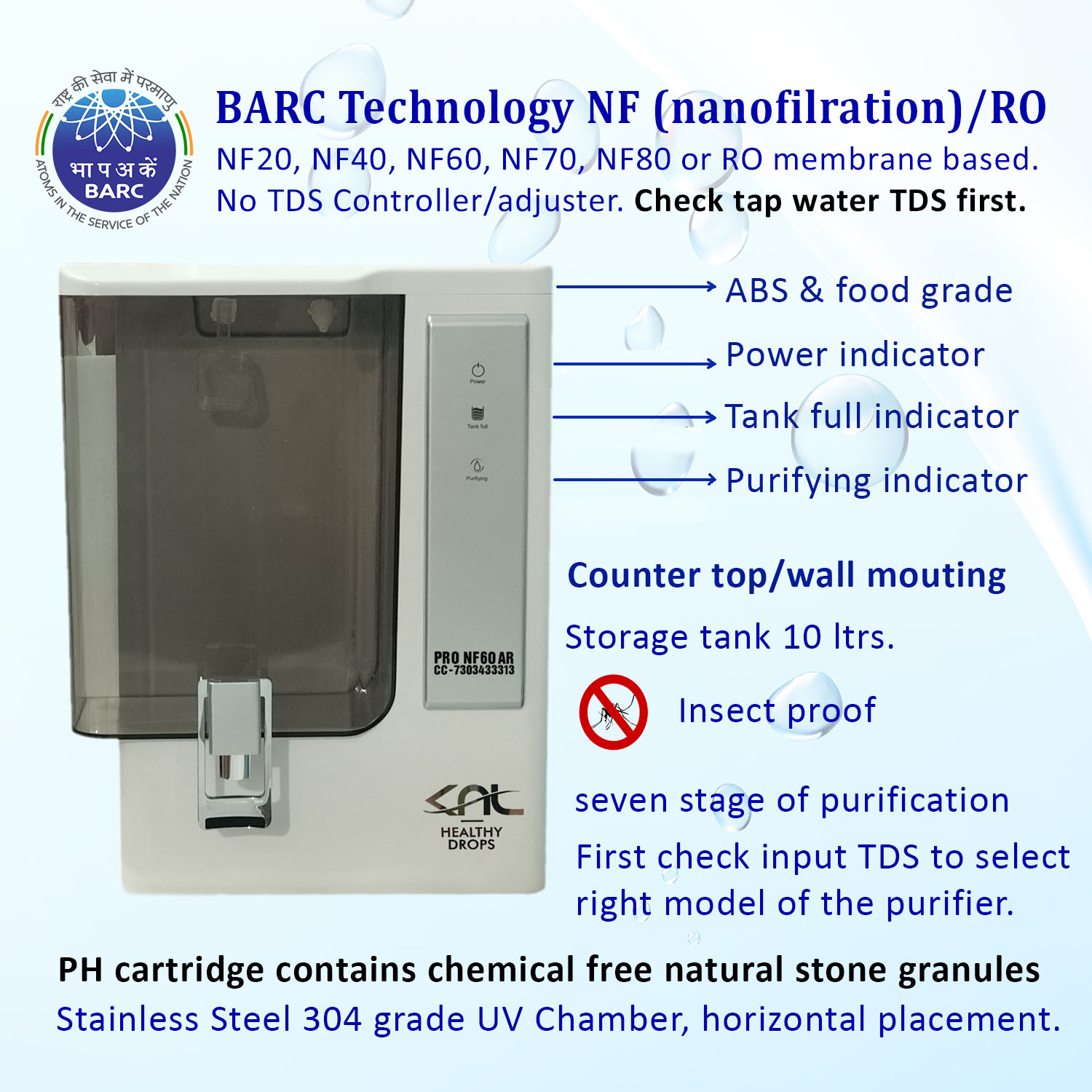 Advantage/Benefits of NF –Ā Nanofiltration technology maintain healthy minerals in drinking water naturally without using TDS controller, water wastage is very less compare to RO technology, RO removes all the necessary mineral if raw water TDS is less than 1200 ppm. TDS controller permits the return of impurities to your drinking water.