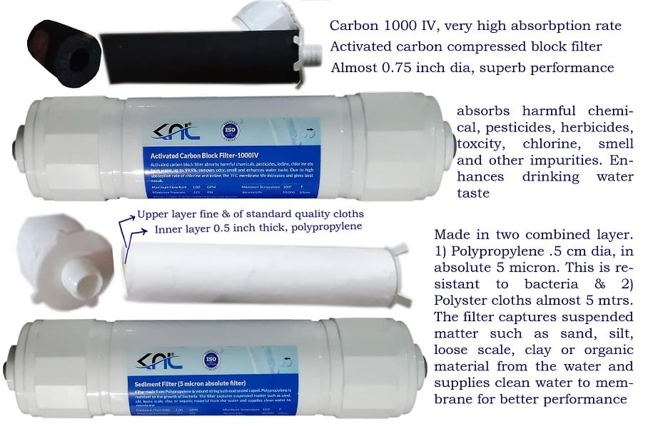 Stage 3 » Activated Carbon Block Filter (Common in each case) (1000 IV) Made from activated carbon in solid cylindrical block, absorbs harmful chemicals, toxic substances, iodine, chlorine etc., removes odour, and enhances water taste. We the KNL uses only activated block carbon over charcoal granules. Charcoal granules (filled half in filter) floats when water goes through and cannot absorbs the chlorine and impurities properly. Service life 10000 liters.
