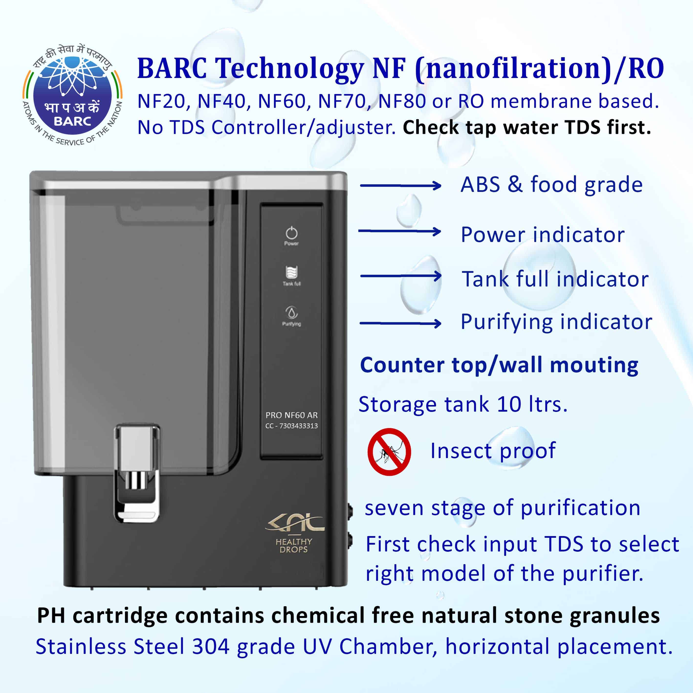 Advantage/Benefits of NF –Â Nanofiltration technology maintain healthy minerals in drinking water naturally without using TDS controller, water wastage is very less compare to RO technology, RO removes all the necessary mineral if raw water TDS is less than 1200 ppm. TDS controller permits the return of impurities to your drinking water.
